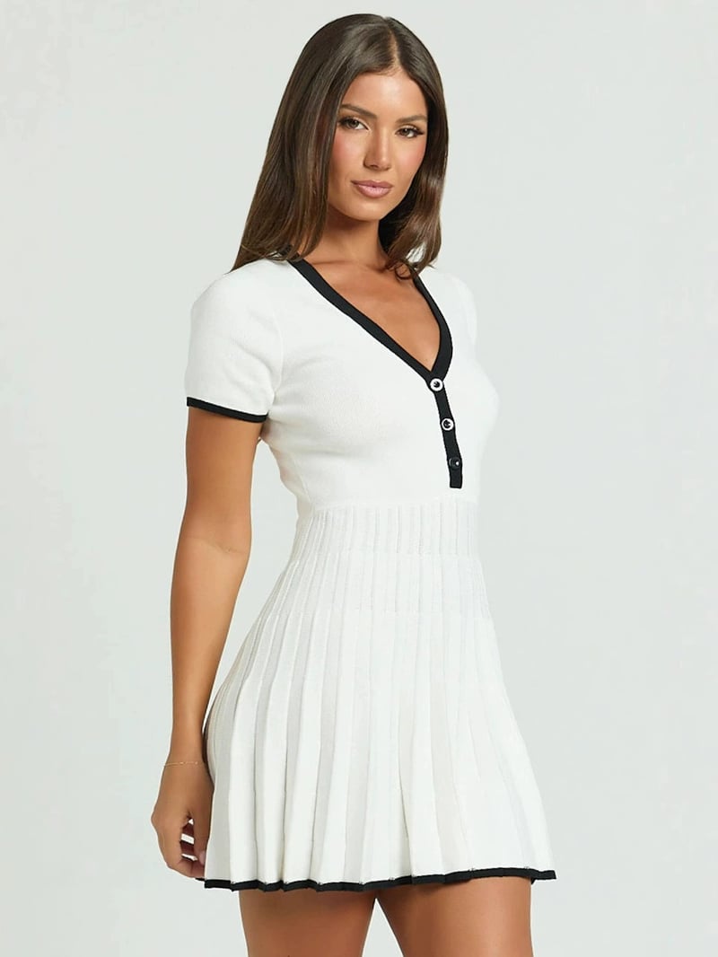 French Style Knit Dress 👗 | Short Sleeve V-Neck Pleated Dress for Effortless Chic🌸